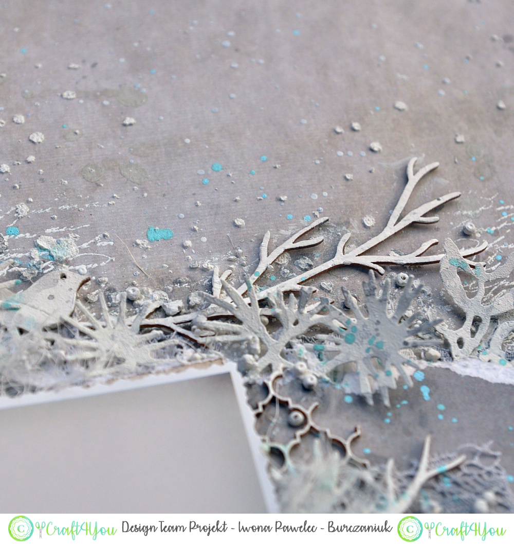 Ja na początek użyłam białej pasty strukturalnej, którą nałożyłam za pomocą maski Tima Holtza "Speckles". Zimową kompozycję stworzyłam z wykrojnikowych wycinanek, elementów ze sklejki z zestawu "Festive Foliage" od Kaisercraft oraz kilku tekturek. Wycinanki i elementy ze sklejki przed naklejeniem pokryłam cienką warstwą białego gesso, dzięki czemu ujednoliciłam ich kolorystykę (wycinanki postał z resztek papieru wizytówkowego, więc nieco różniły się odcieniami). Na tekturkach natomiast zastosowałam biały puder do embossingu.
